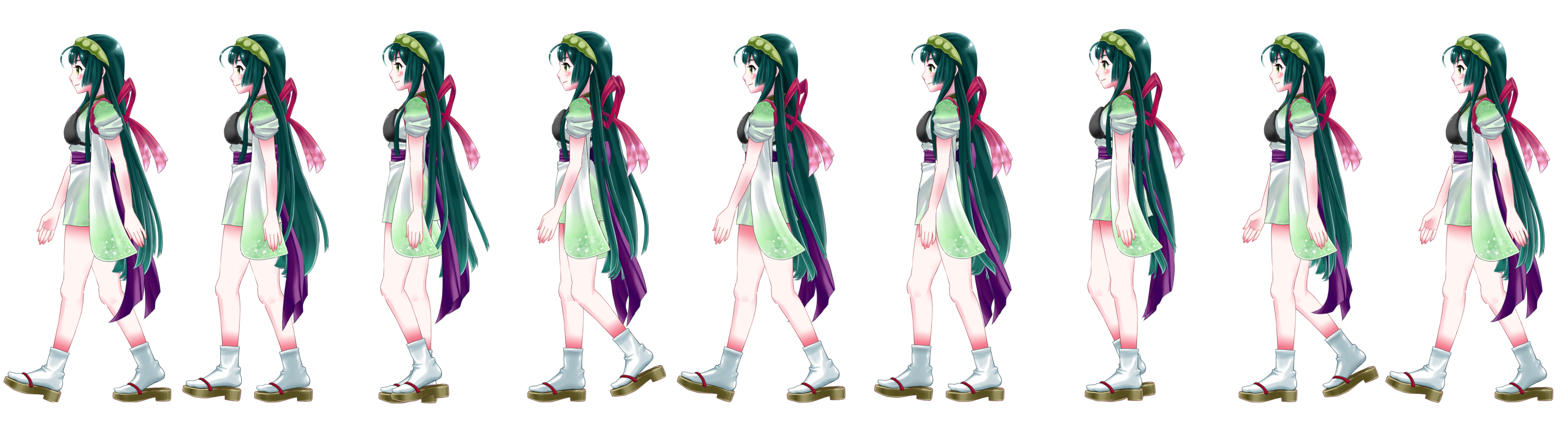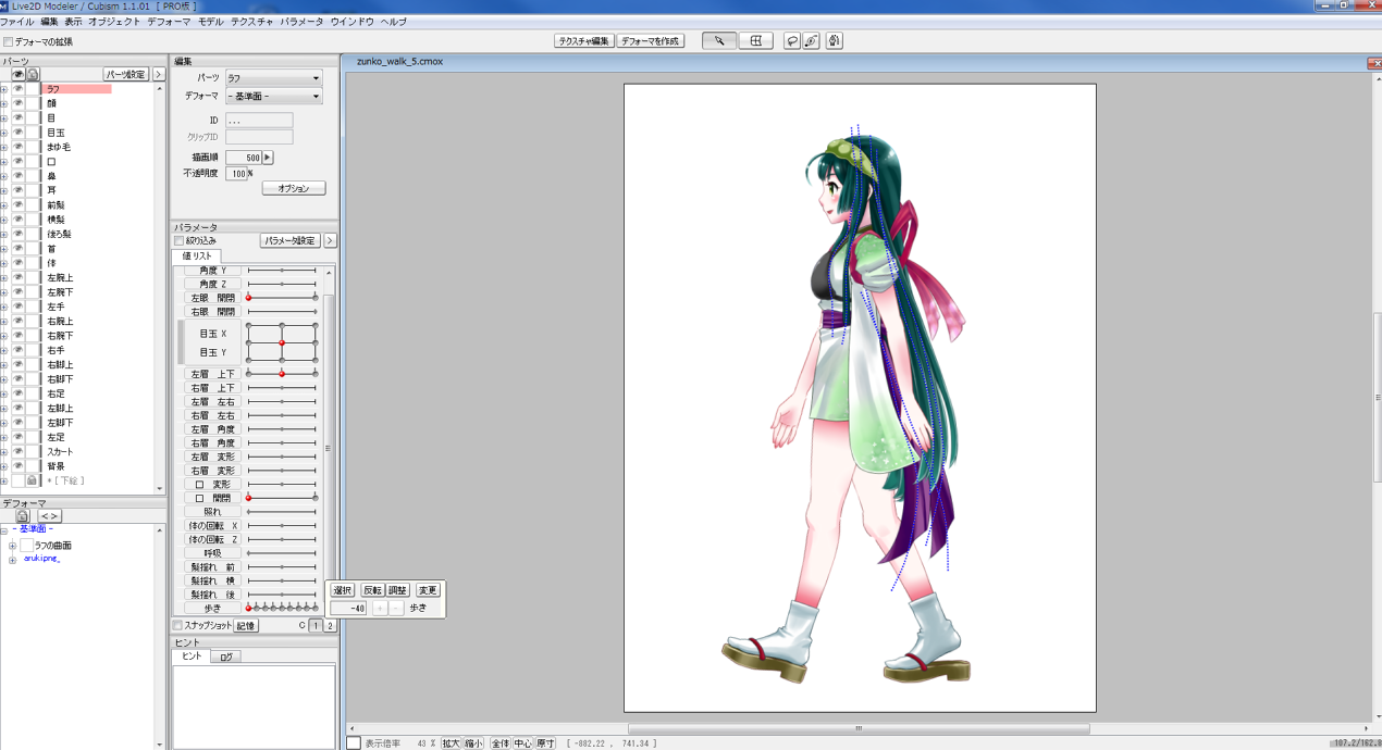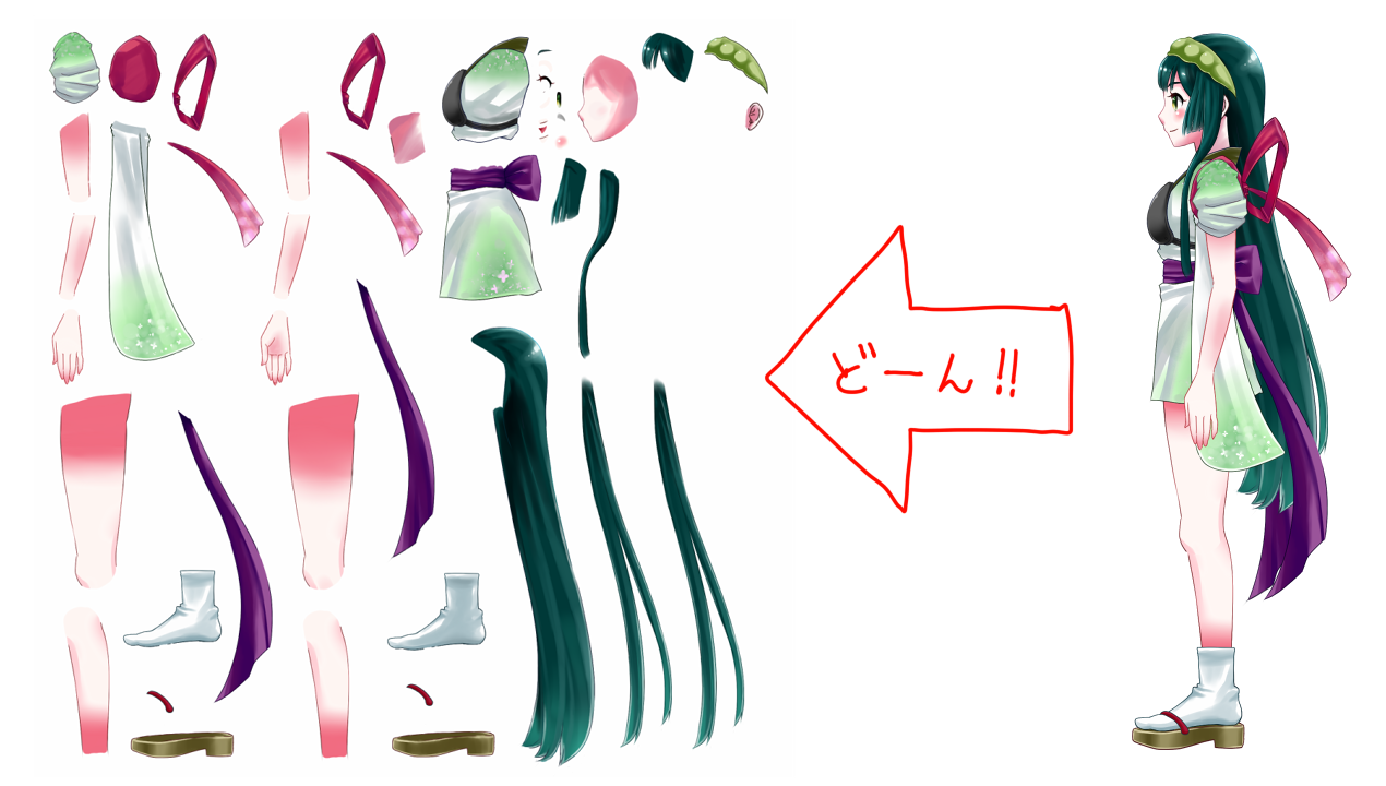 低すぎて、悶絶しているSevenAです、こんばんわ。 (まずは、地道に晩強あるのみw) いろんな事に手を出しつつも、ずん子さん歩かせ計画は少しずつ 進行させておりました。 ①まずは、パーツ分けを前提に横向きのずん子さんをsaiで根気よく 作成。 ②そしてずん子さんを「どーーーん!!!」とバラす! 2048×2048の中にバラバラのパーツを敷き詰めますw ちょっと怖いですけどw ③Live2D Cubism上でバラバラずん子さんを再構築して 歩くためのパラメーターを割り当てます。 ちょっと前にオリジナルキャラの歩きの設定を していたので、参考にしながらずん子さんも設定して いきました。 しかし、前よりパーツがかなり多いせいか、描画順ですこし 混乱してしまい、苦戦w 今回も原画部分を9枚にして1と9が同じものになるように 設定してます。 ④そして、ものモデラーデータをアニメーターに取り込んで 出力したgif動画がコレ。 原画8枚のループになります~。 (8fps) ⑤そしてこの間の中割りをCubismさんにやって頂くので 前のオリジナルキャラの歩行のモーションをコピーして ペーストぽん!! 楽だぁ~w いや~、歩きの動作ってほぼ同じなところがありますので Cubismになってからこの機能が出来て嬉しいかぎりですw まだちょっと動きを調整したい部分があるので、背景なんかと 組み合わせた滑らか30fpsバージョンも、ちまちま作って 行こうかと思いますw テスト的に、東北のいろんな観光名所をずん子さんに 歩いてもらいたいですね~。 レポーター的な感じでw いろいろ展開出来そうで楽しくなってきましたw